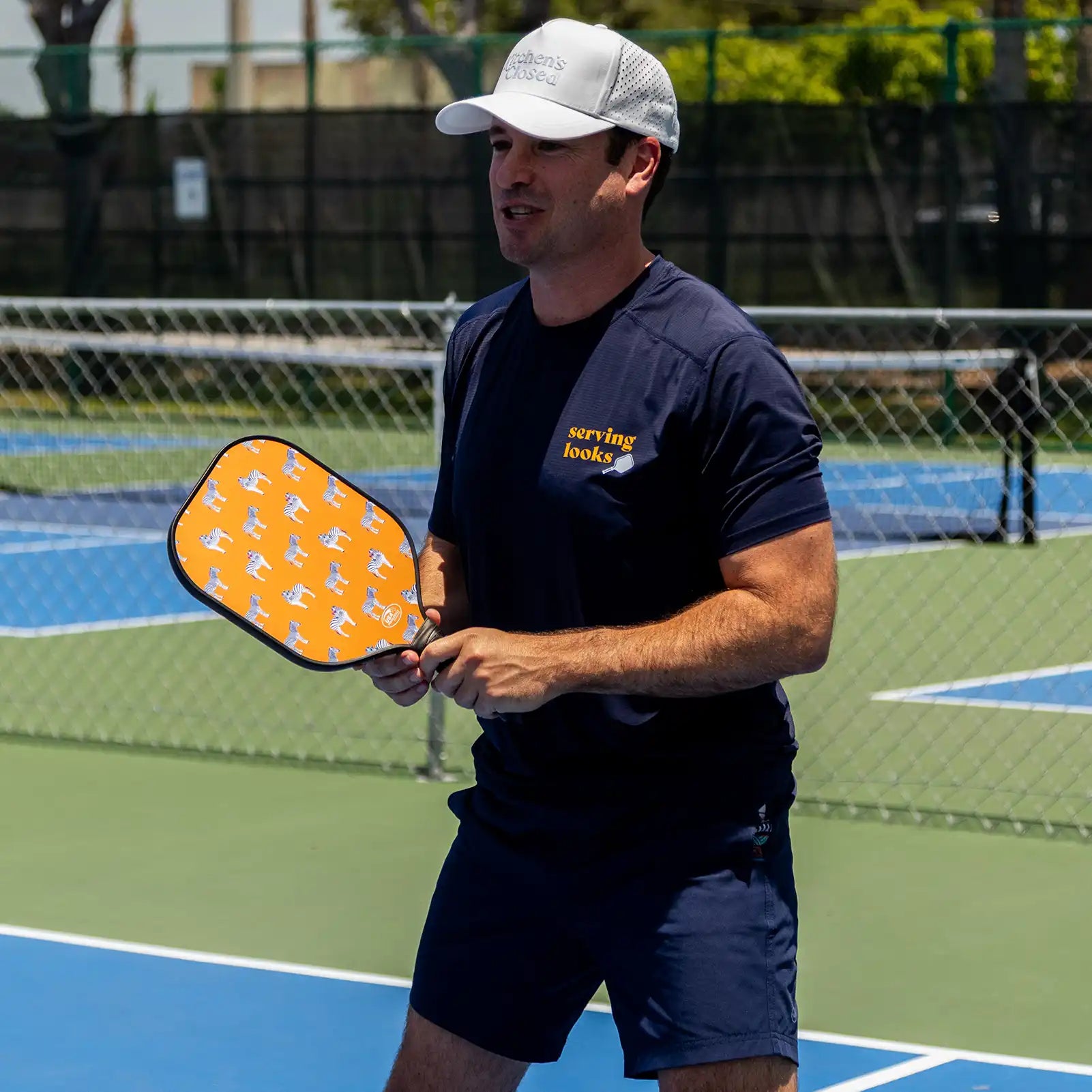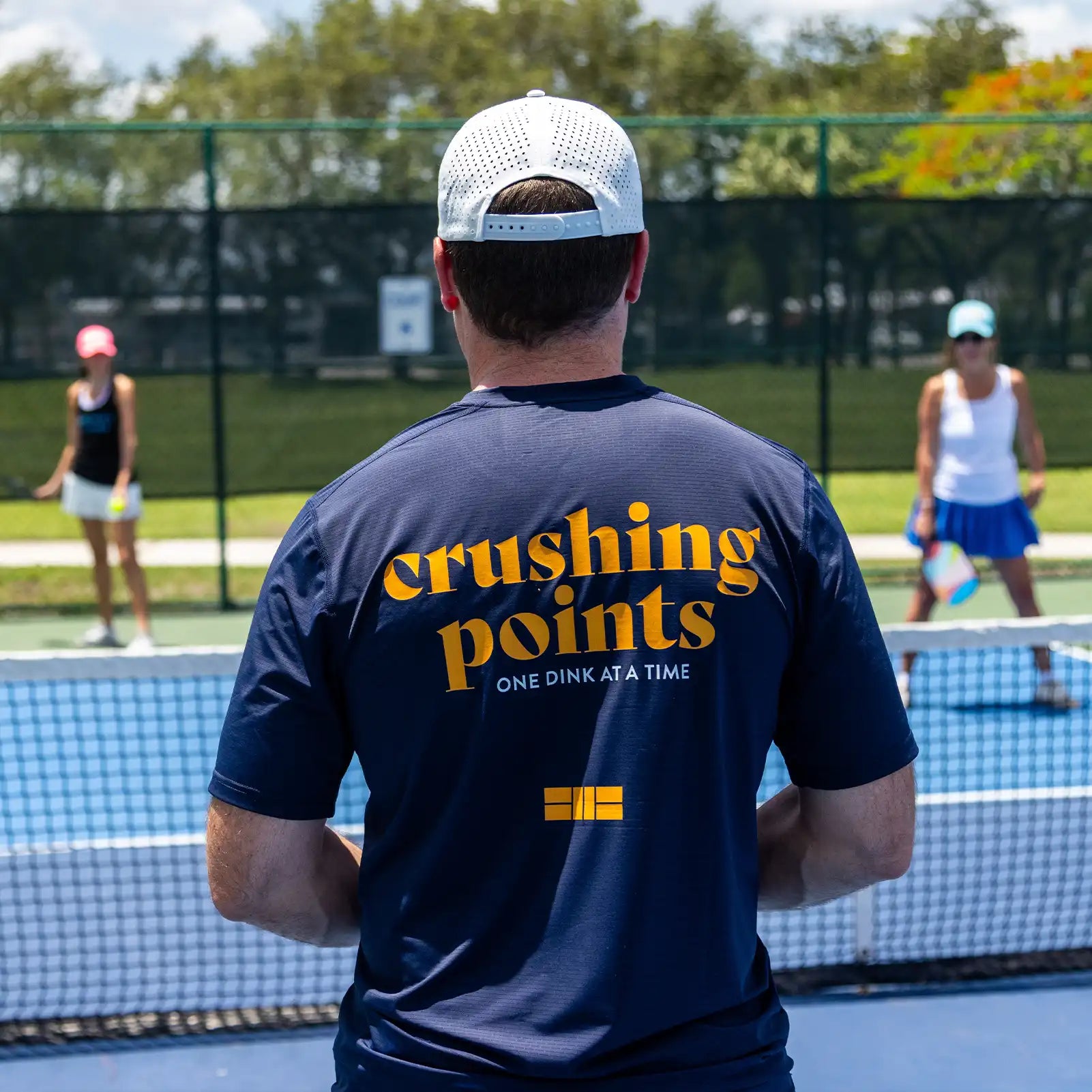 Men's pickleball shirt for those Serving Looks, and Crushing Points, One Dink at a Time on the pickleball court. It comes in our best selling navy luxe material that is buttery soft and performance ready. Navy blue with orange detail and features our court icon on the back below the slogan. Also available in women's sizes for those mixed doubles pickleball teams that crush.