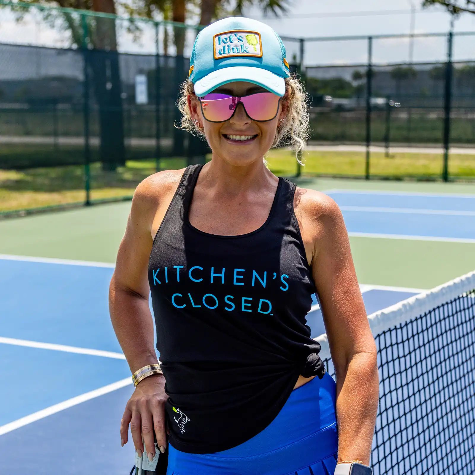 Your favorite pickleball tank top with our Kitchen's Closed slogan in navy with blue writing. This buttery soft LUX performance fabric has a racerback and stretchy fit. It feels great moving around the pickleball court during hours of play.