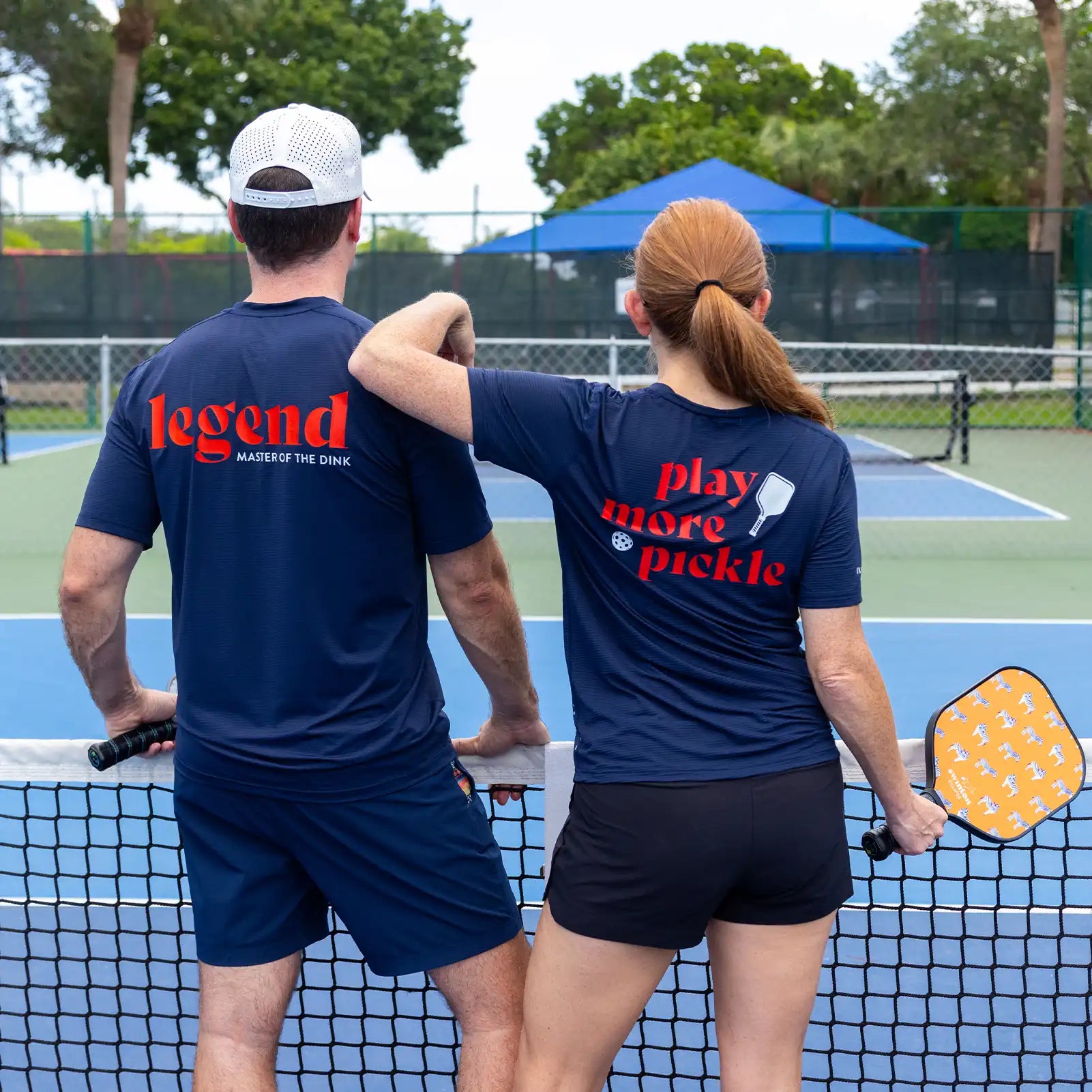 The perfect women's pickleball shirt - "Let's Dink" on the front and "Play More Pickle on the Back" in this sharp navy and red color combo. This LUX performance material feels super light on the court, perfect for a long day of pickleball. This shirt is also available in a men's style as well for those mixed doubles days.
